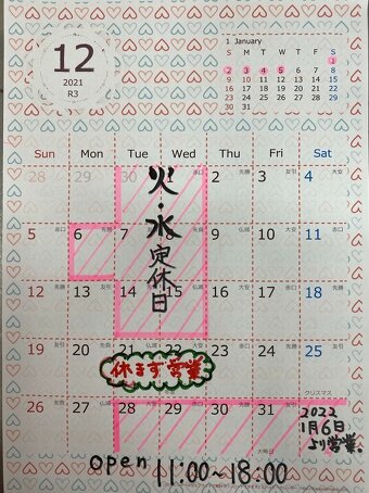 12月定休日のお知らせ