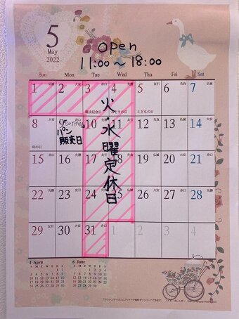 5月はTayoRi cafe α は毎週火・水曜日が定休日他、