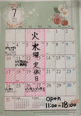 7月はTayoRi cafe α は毎週火・水曜日が定休日他、
