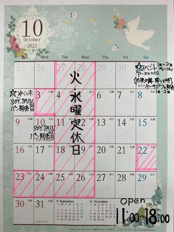 誠に勝手ながら10月3日(月)・22日(土)〜26日(水)もお休みとさせていただきます。
