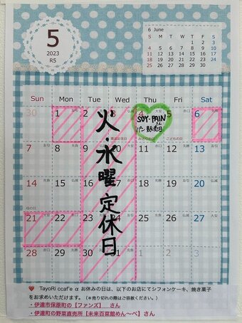 5月はTayoRi cafe α は毎週火・水曜日が定休日他、