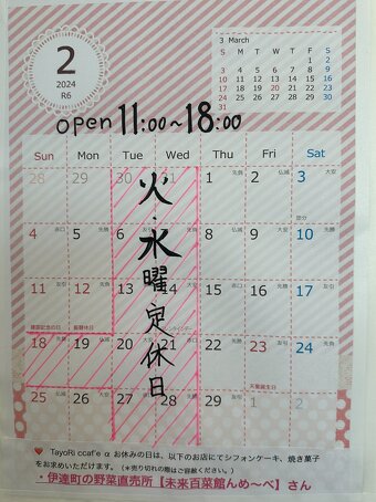 定休TayoRi cafe α は毎週火・水曜日が定休日 他、