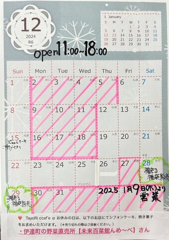 12月は誠に勝手ながら2024年12月2日(月)・ 5日(木)・9日(月)・16(月)・27(金)もお休みとさせていただきます。