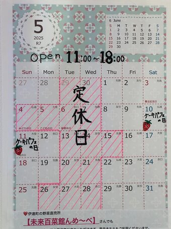 2025年05月01日(木) 5月定休日のお知らせです 5月定休日のお知らせです。 火曜日水曜日は定休日です 他 4日(日)・5日(月)・15日(木)・26日(月) もお休みさせていただきます。 ご不便をおかけいたします。 なお お休みの日は 伊達市【未来百菜館んめ〜べ】さんにて シフォンケーキなどお求めできます。 そちらも是非ご利用ください。
