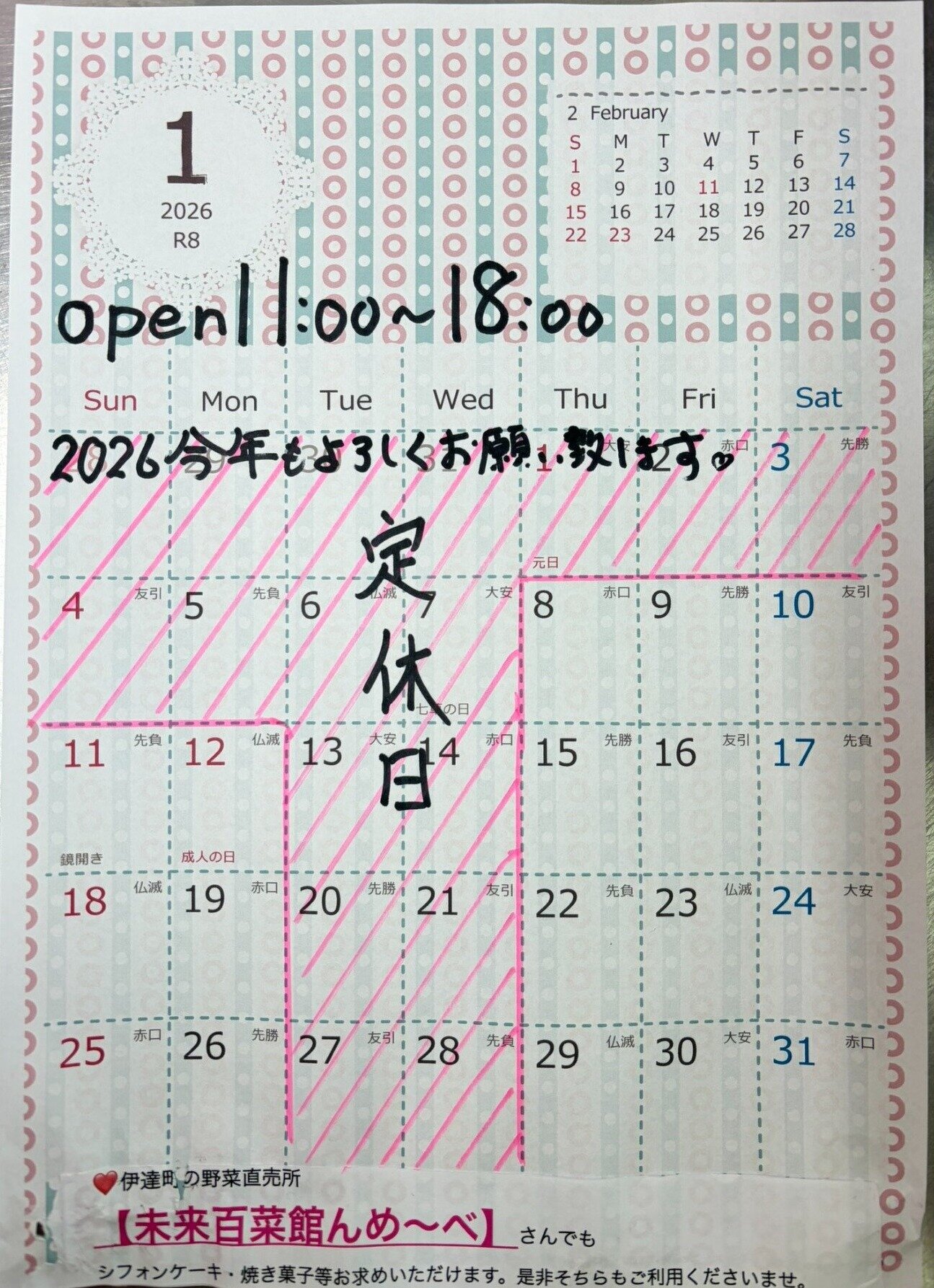 2025年12月20日(土) 2026年1月定休日のお知らせです。 2026・1月は 8日(木)より営業いたします。 2026年もどうぞよろしくお願いします。 お休みの間【未来百菜館んめ〜べ】さんにてシフォンケーキなど販売しております 尚、 未来百菜館んめ〜べ さんのお休みは12月31日〜1月 4日までです。
