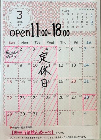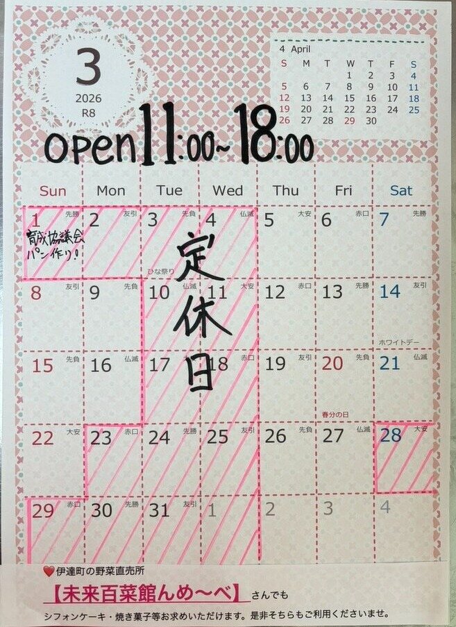 2026年02月22日(日) 3月定休日のお知らせです。 3月定休日のお知らせです。 ご覧いただきありがとうございます。 3月は火曜・水曜日の他、 2日(月)・21日(月)・28日(土)・29日(日)・30日(月)も お休みさせていただきます。 尚、 お休みの日は 伊達市【未来百菜館んめ〜べ】さんにて シフォンケーキなどお求めできます。 そちらも是非ご利用ください。