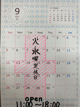 また、9月13日(月)・16日(木)もご不便をおかけしますが、お休みをいただきます。